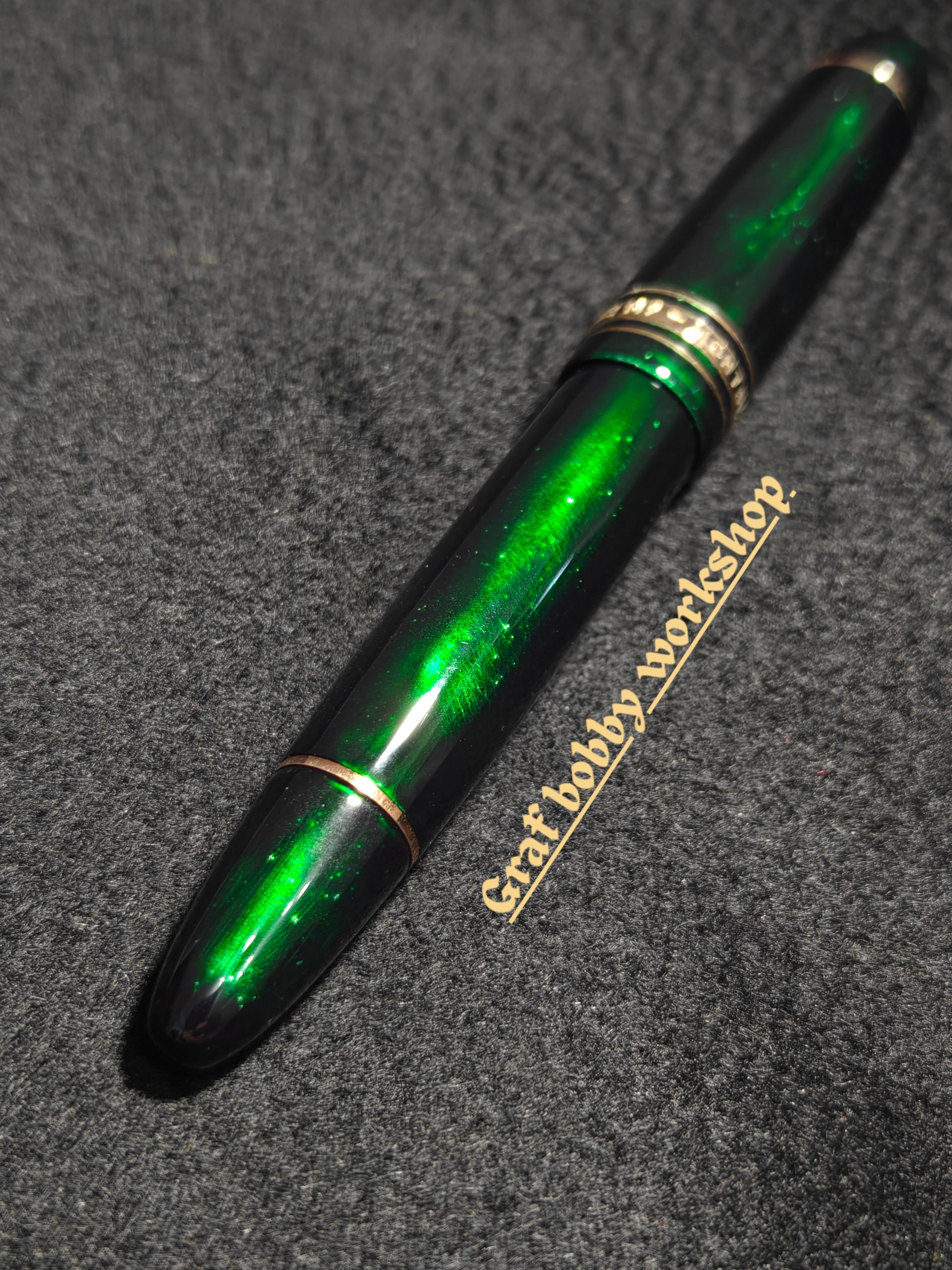 The process of making Green Gem Sand starts like most lacquerware: by coating the pen’s surface with urushi. Then, silver powder is sprinkled on top to create a metallic silver sheen. A layer of transparent green urushi is applied over that, and the process is repeated several times. The result is a captivating green luster.