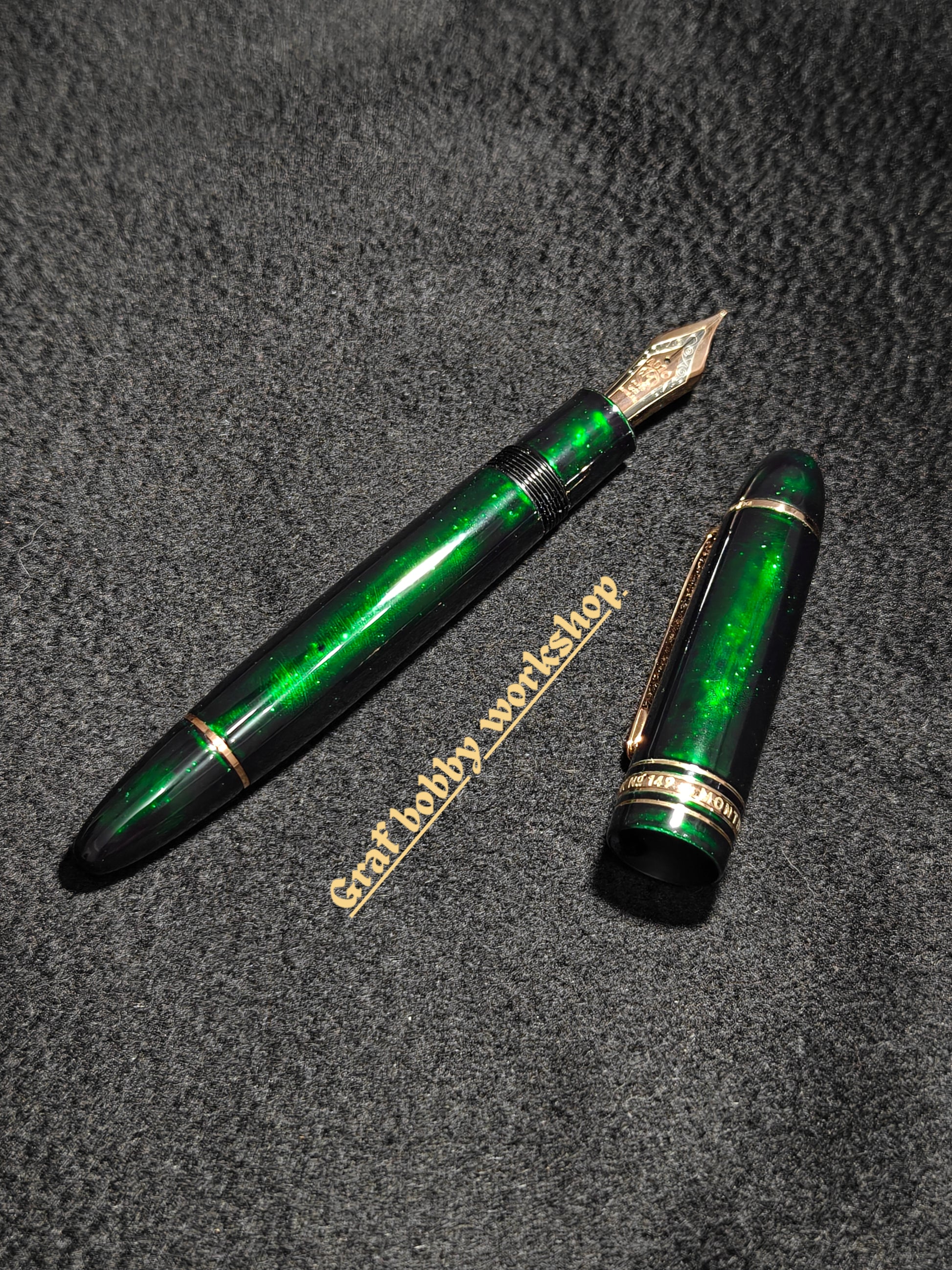The process of making Green Gem Sand starts like most lacquerware: by coating the pen’s surface with urushi. Then, silver powder is sprinkled on top to create a metallic silver sheen. A layer of transparent green urushi is applied over that, and the process is repeated several times. The result is a captivating green luster.