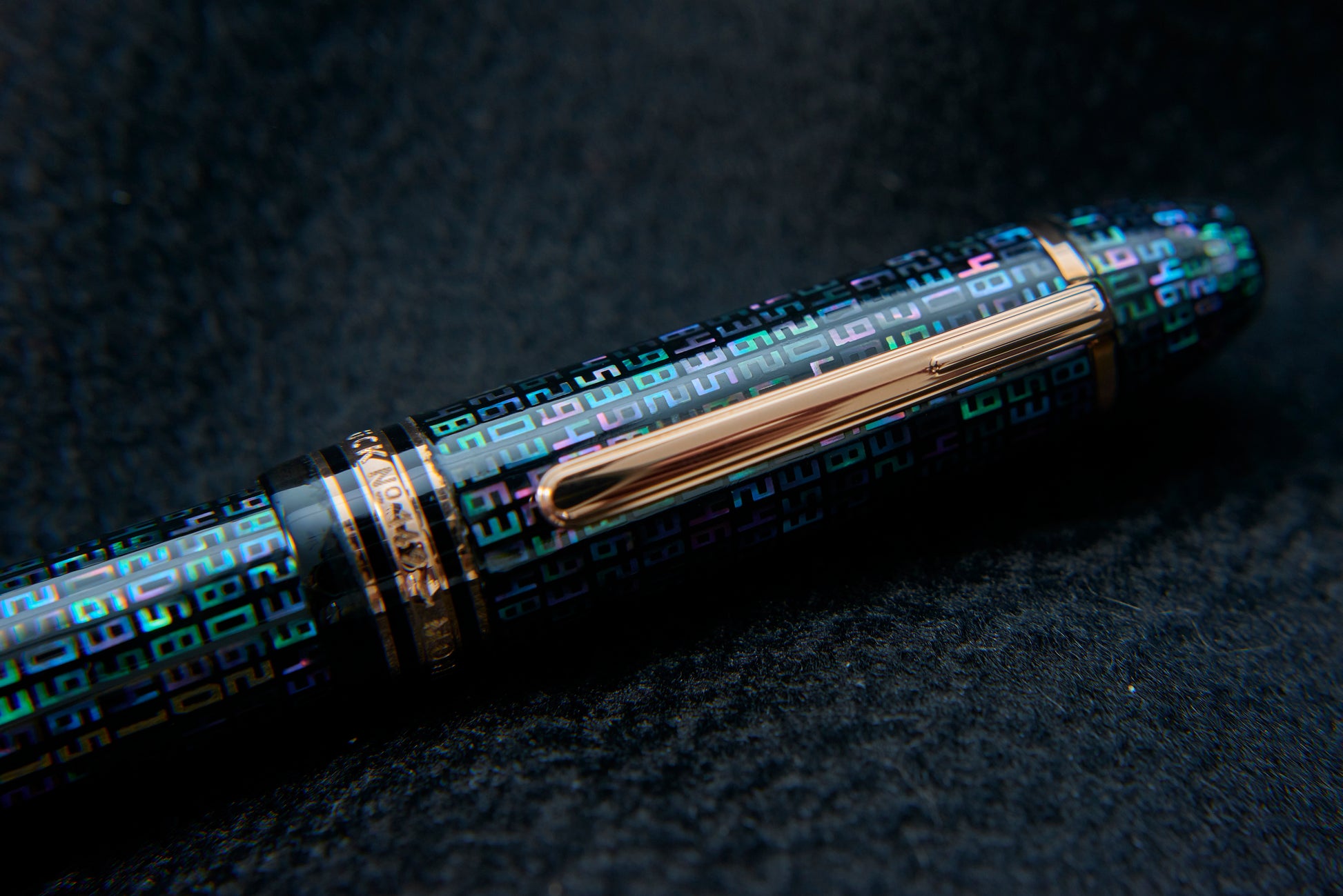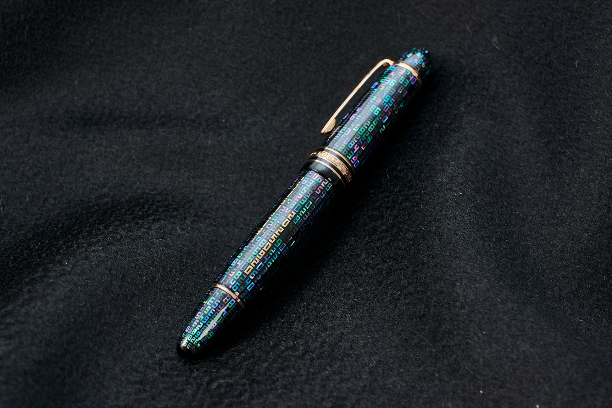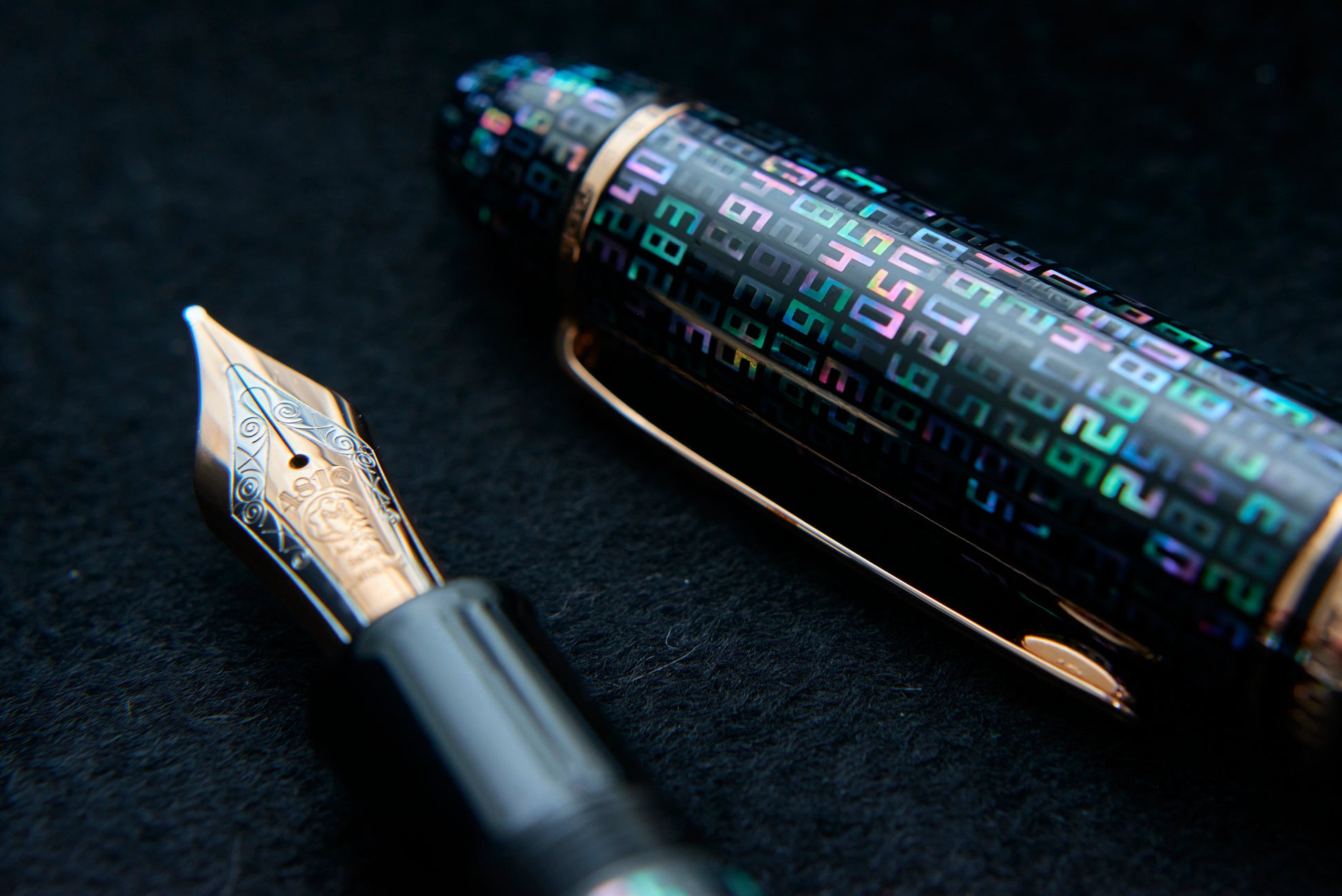 Using laser cutting, mother-of-pearl and gold are shaped into numbers and carefully inlaid by hand on the pen’s surface.