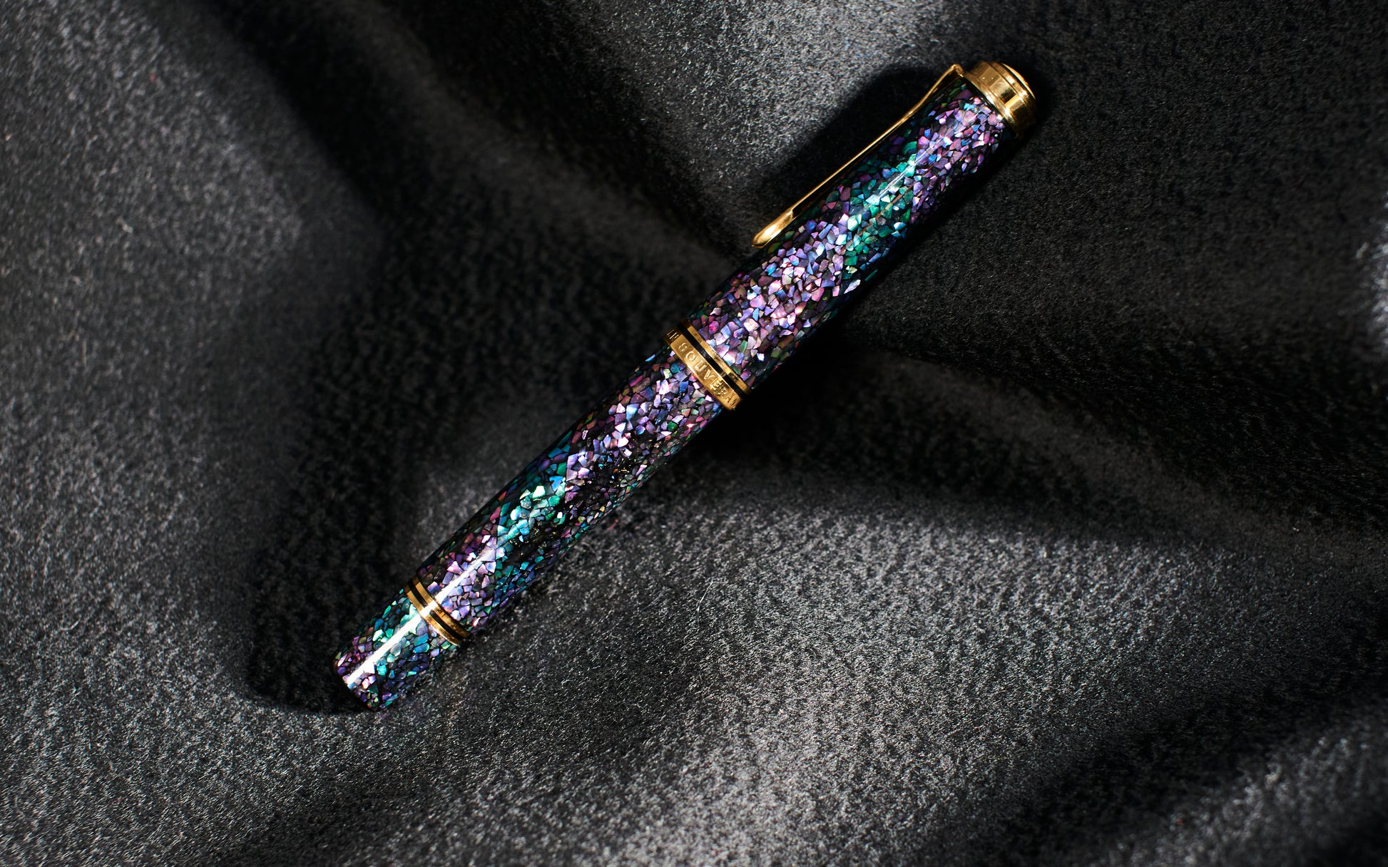 The raden that wraps around the entire pen has a very clear color separation. In reality, these fragmented raden pieces are all made from aogai shell. We carefully sort the green and red aogai shells, then separately create and inlay the raden pieces to achieve the interwoven two-color effect.